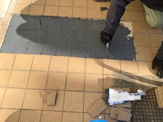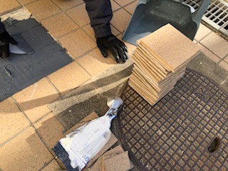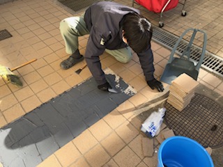 管理作業員が中庭のタイルの点検をして、安全を期して、貼り直しています。
