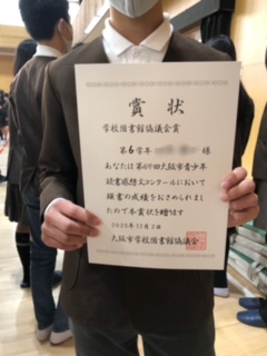 ◯読書感想文コンクールの表彰をしました。