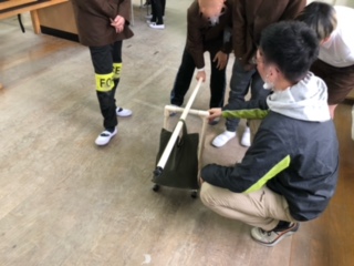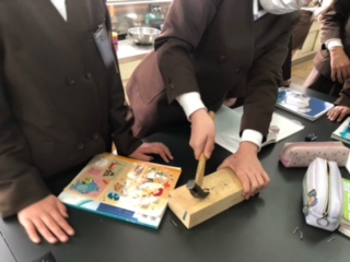 てこの原理を実験で確かめています。写真上は、てこの実験装置です。持つところ、おもりを置く位置を変えながら重さの違いを確かめています。