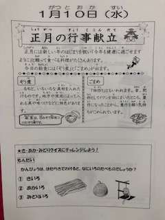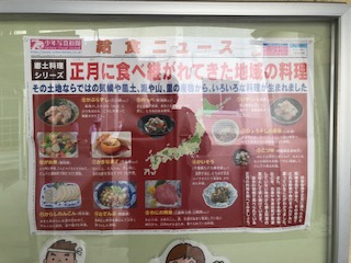 今日のお正月行事献立、1月の給食献立が教室に掲示されています。給食室には、給食ニュースなどが掲示されています。