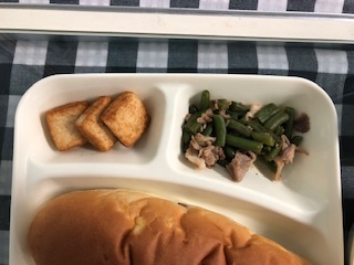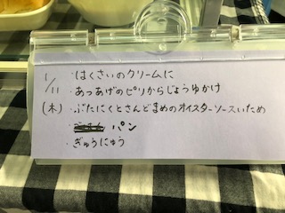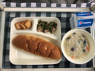 今日の給食には、クリーム煮がでました。体が温まります。パンにはさつまいもが入っています。