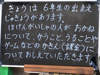 今日は6年生が生命保険会社の方の出前授業を受けます。物を買うことや売ることのきまりや、ゲームなどの課金についてお話していただきます。