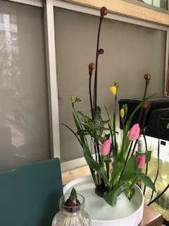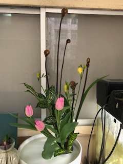 校長室の前、水槽の横にきれいなお花がいけられてありました。生涯学習の皆様、ありがとうございます。一足早く春を味わっています。