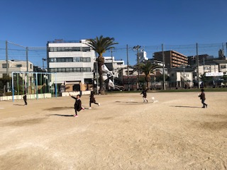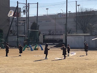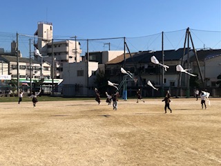 晴れた運動場で1年生が自分で作ったたこをあげました。