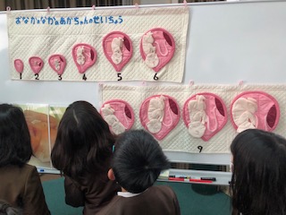 写真下は、赤ちゃんがおなかの中で成長する様子をあらわした模型です。