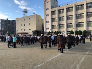 今日の児童朝会は給食週間について校長から話しました。その後、給食調理員さんに朝礼台にあがっていただきました。