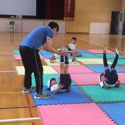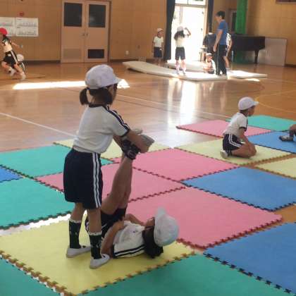 各種目の練習は音楽を聞いて移動します。授業の随所に工夫が見えます。