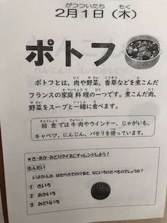 今日の給食は、ポトフです。フランスの家庭料理です。