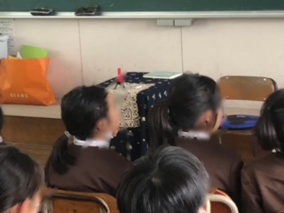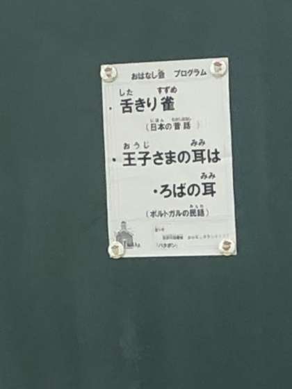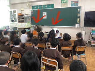 読み聞かせの団体「パタポン」の方々(赤矢印)による読み聞かせです。本を読むのではなく、物語の内容をお話していきます。