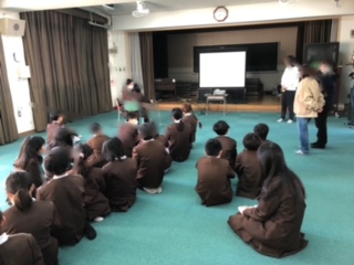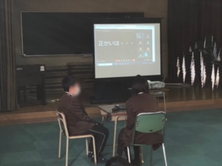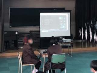 今日の児童集会は、児童の委員会発表です。多目的室からオンラインで行いました。