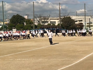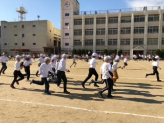 奇数学年と偶数学年ごとに分けてかけ足をしています。内、中、外のコースにわかれて走っていきます。