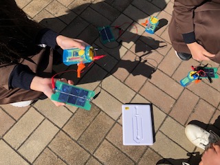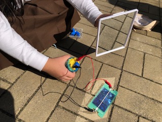 コンデンサーに蓄電する実験です。今日は太陽電池(ソーラー)を使っています。鏡で太陽光を当てています。