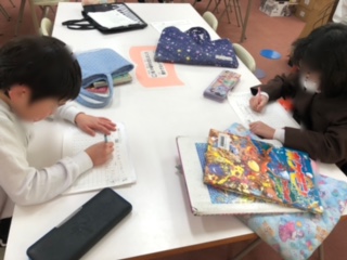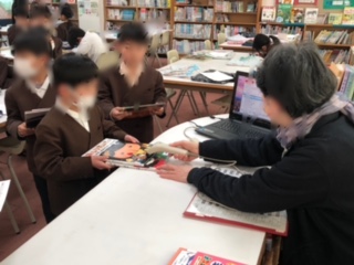 毎週火曜日は学校司書の方が図書館におられます。写真下は、読書カードを書いているところです。