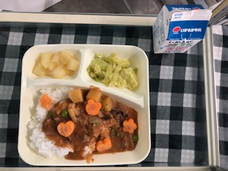 今日の給食はハヤシライスでした。缶詰の洋梨もつきました。