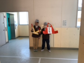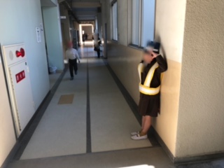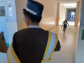 代表委員の子どもたちが廊下に立って、他の子どもたちに右側を歩くことを促しています。
