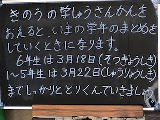 6年生は3月18日が卒業式、1年生から6年生は3月22日の修了式が最後となります。
