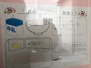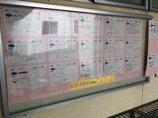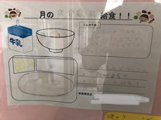 給食室の掲示板には、大和田小学校の子どもたちが考えた献立が掲示されています