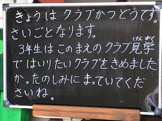 今日は最後のクラブ活動です。6年生は小学校生活最後のクラブですね。3年生は4年生になったらクラブ活動を始めます。楽しみに待っててね。