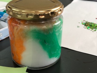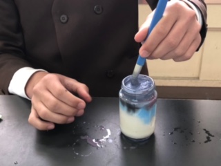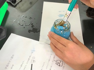 「宇宙のビン詰め」のテーマでの工作です。絵の具を綿に染み込ませて宇宙のイメージを表現しています。