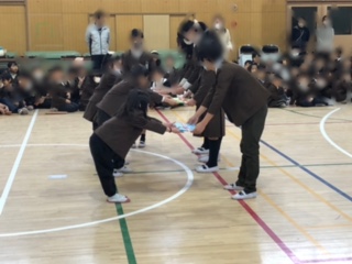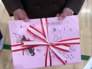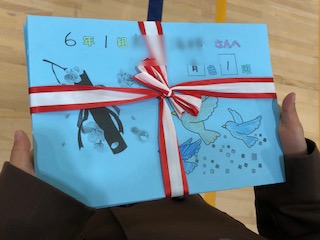 6年生に在校生からメッセージカードが手渡されました。たてわり班のみんなが6年生一人一人に向けてかきました。