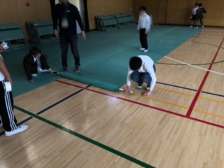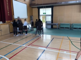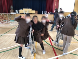 5年生が卒業式に向けて講堂のそうじやシート敷きをしています