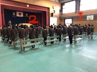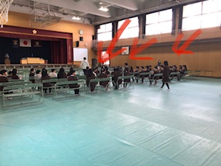 写真下は、卒業生の座席に立っているところです。舞台に向かって右が1組、左が2組です。