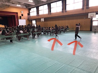 写真上、中は最初の入場です。赤矢印が6年生です。