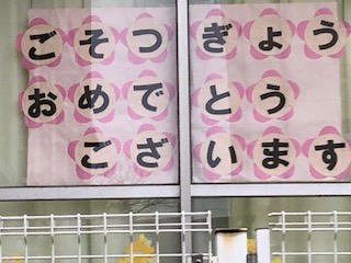 写真下は、いきいき教室の窓にあるメッセージです。中庭からよく見えます。