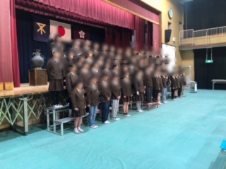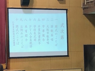 卒業式は、国歌、大阪市歌、卒業証書授与、学校長式辞、PTA会長祝辞と続き、卒業生と在校生(5年生)による別れのことばへとなります。この時、卒業生はひな壇に立ちます。