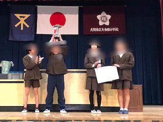 卒業式予行の後、地区の大会で準優勝したソフトボールチームを表彰しました。