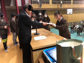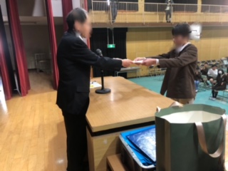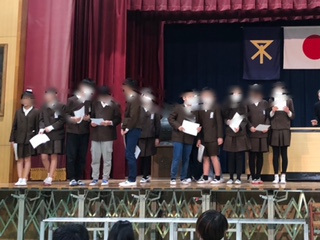 昨日の卒業式予行の後、講堂の舞台で6年生の代表委員会(学級代表、委員会代表)児童に表彰状が手渡されました