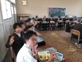 6年生の教室で最後の給食を食べている子どもたちです。今日は特別な机の並べ方です。