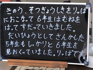 在校生代表として参加した5年生もしっかりと卒業式を見送っていました。今日からは5年生が実質的な最高学年となります。それにふさわしい活躍をしていました。5年生のみなさん、ありがとうございました。