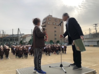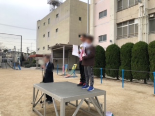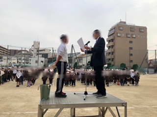 児童朝会で地域のソフトボールクラブの5年生代表に、準優勝の表彰とカップを校長から手渡しました。6年生には先週、手渡しています。