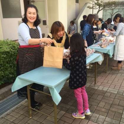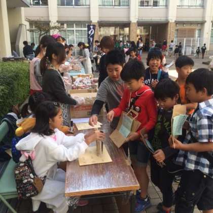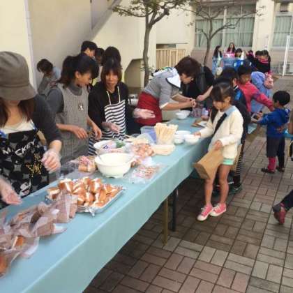 主催、共催いただいている、町内の皆さんが、中庭周辺で様々な模擬店をされています。おうどん、ポップコーン、ウィンナー、パン、たこせんべい、ミルクせんべい、キャンディすくい、など子どもたちは大満足です。
