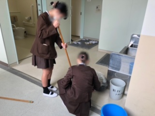 教室、講堂やトイレ前などをていねいにそうじしています