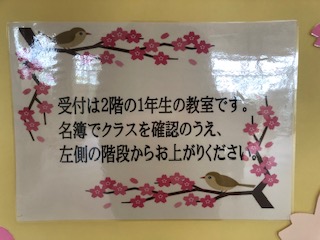 新1年生の受付は2階の1年生の教室です。2階にお上りください。エレベーター横の階段です。