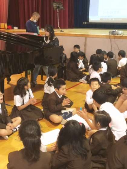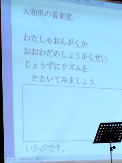 大和田の音楽家(山の音楽家のメロディ)の歌に、班ごとに考えた言葉のリズムを入れて手を打ちます。