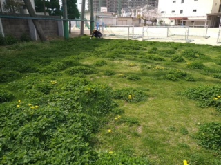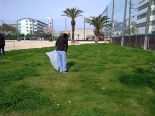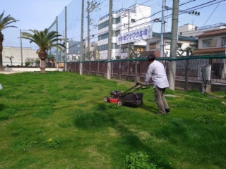 芝生実行委員会、PTAのみなさんが芝生の雑草刈り取りなどのメンテナンスをされました。桜も満開になると芝生にもたくさんの雑草が生えてきていました。(写真上)