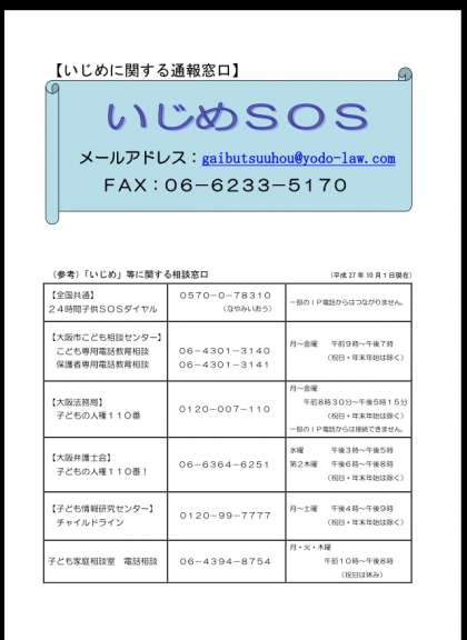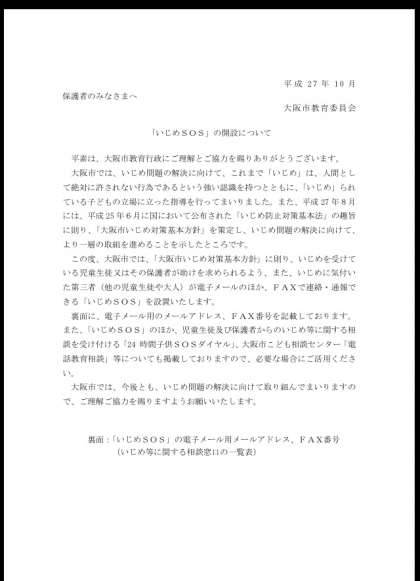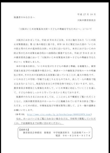 「 大阪市のいじめ対策基本方針 〜子どもの尊厳を守るために〜 について」および「いじめSOSの開設について」のお手紙を本日配付いたします。