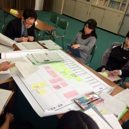 いろいろな見方、考え方を互いに聞きあいながら、自分自身の指導を振り返り、指導の改善を行います。