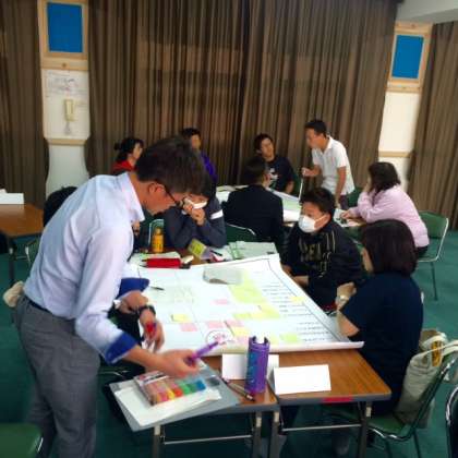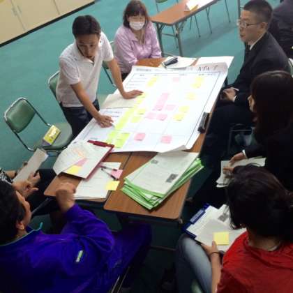教職員が小グループに分かれ、ワークショップ型研究協議を行っています。