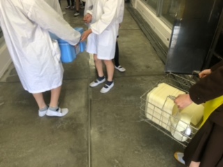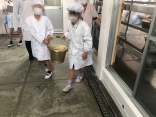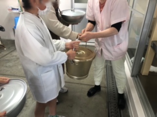 に入っておかすの食缶や牛乳、ご飯やパン箱を受け取ります。給食調理員さんがやさしく手渡しています。