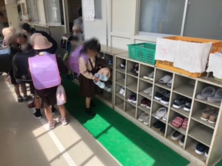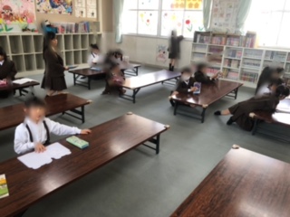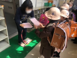 1年生がいきいき活動の教室に行きます。担当の方が一人一人カードを確認しながら進めておられます。