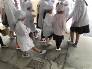 今週から1年生も給食の用意をしていきます。今日は6年生がそばについていっしょに行います。