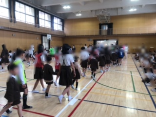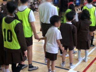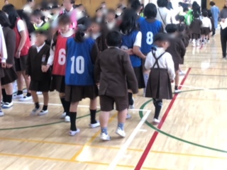 6年生はやさしく1年生を会場へと案内しました(6年生の多くはビブス・ゼッケンをつけています)