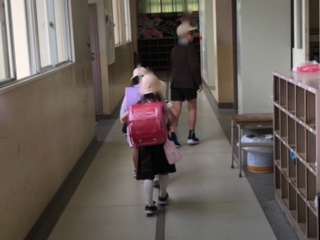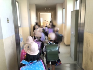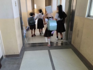 まず、6年生が1年生を教室まで迎えにいき、地区別の教室までいっしょにいきます。