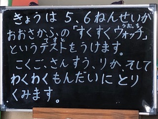 今日は大阪府のテスト・すくすくウォッチを5年生と6年生が受けます。国語、算数、理科、そして、わくわく問題です。