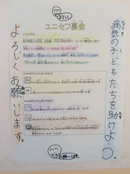 校内には手作りのポスターが貼られ、募金袋も配付しました。