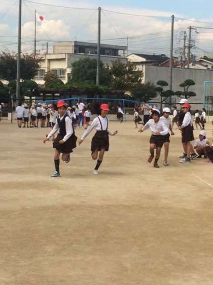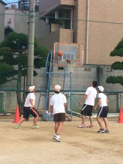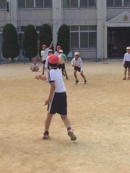 運動場でも元気に遊びます。友達とドッジボール、先生とバスケットボール、学級あげてリレーをしているクラスもあります。